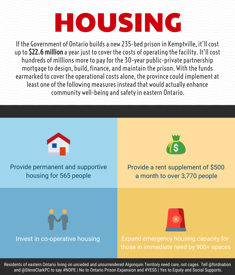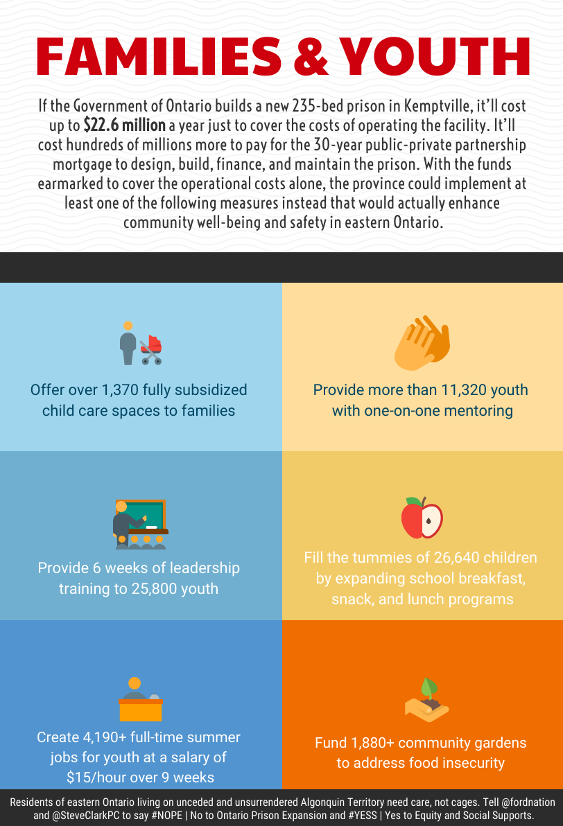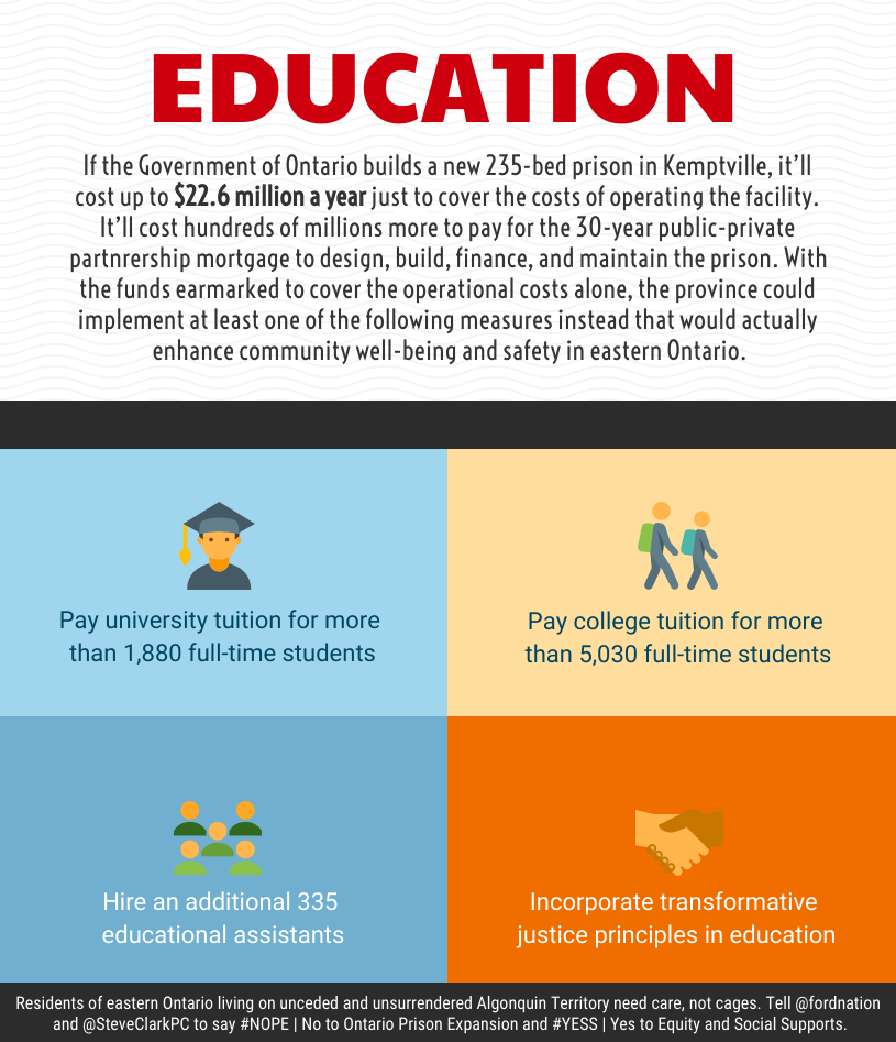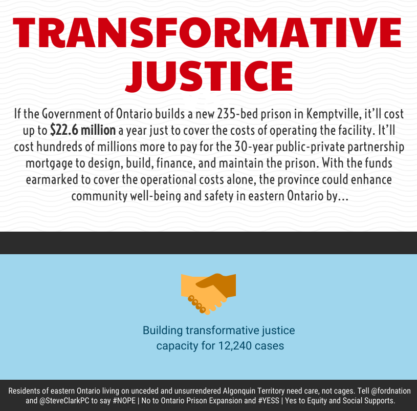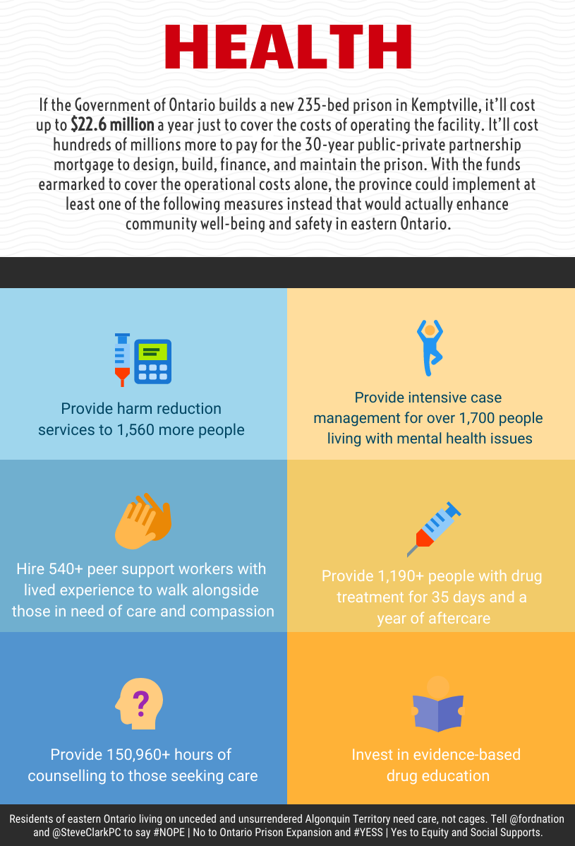 According to the latest figures from Statistics Canada, it costs an average of $264 per day or $96,360 per year to imprison just one person in Ontario’s jails and prisons. If the Government of Ontario builds a new 235-bed prison in Kemptville, it’ll cost up to $22.6 million a year just to cover the operations of the facility. It’ll cost hundreds of millions more to pay for the 30-year public-private-partnership mortgage to design, build, finance and maintain the prison. With the funds earmarked to cover the operational costs alone, the province could implement any one of the following measures instead that would actually enhance community well-being and safety in Eastern Ontario.