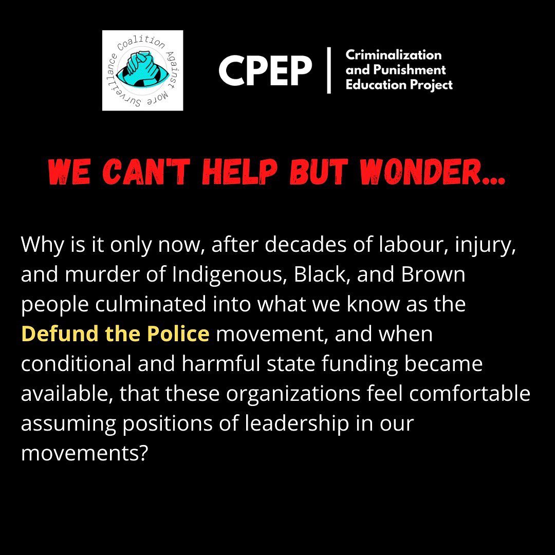 CPEP and CAMS (The Coalition Against More Surveillance) have been pushing for the defunding of the Ottawa Police Service prior to what culminated into the Defund the Police movement with the lynching of George Floyd and the killing of Regis Korchinsky Paquet and other Indigenous, Black, and Brown people and we have not stopped pushing since then. It is deeply disheartening and infuriating to see people who cliam to be from our community, but are really representing the interests of the powerful, swoop in and secretly try to co-opt our movement from us – from the people who have been calling for this! From the people who have been affected by this! And from the people who NEED THIS! Shame! Read the background information below and please sign the letter to show your support for the local organizers who have been pushing for this.